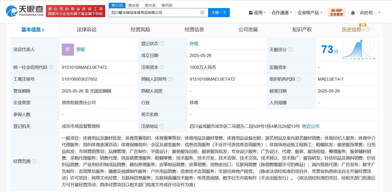 天眼查App显示,近日,四川蜀华雄冠体育用品有限公司成立,法定代表人为罗毅互联网配资平台,注册资本1000万人民币,经营范围含体育用品及器材批发、体育竞赛组织、体育赛事策划、体育经纪人服务、信息咨询服务、服饰研发、产业用纺织制成品销售、国内贸易代理等。股东信息显示,该公司由四川蜀华川体体育发展有限公司、五粮液旗下四川圣山白玉兰实业有限公司分别持股51%、49%。
